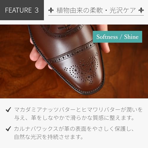 スクワランオイルが、皮革の潤いを保ちます。皮革表面に薄いワックス膜を作り、皮革を保護する植物性のカルナバワックスも配合しています。