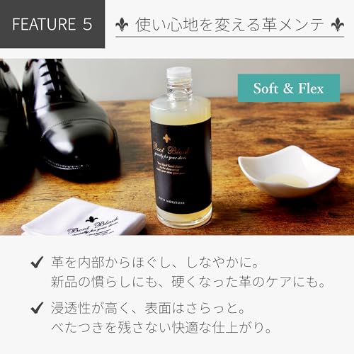 自然な風合いを活かし、コンディションをアップします。ベタ付かず自然な仕上がりは、素材の持ち味を引き出しソフトレザーに最適です。皮革に深く浸透し、乾燥・ひび割れから守り製品を長持ちさせます。
